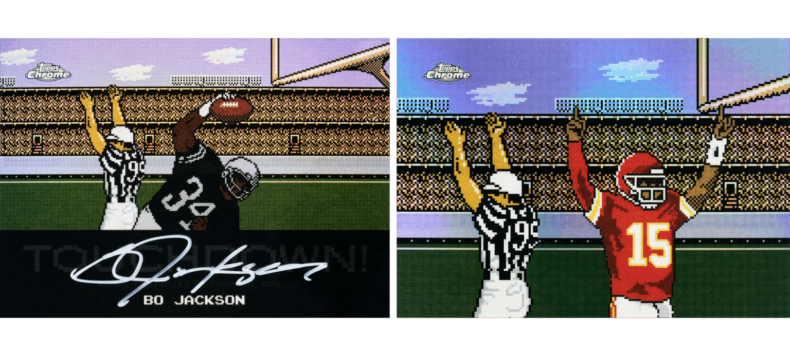 Topps relaunched Chrome Football yesterday, marking its return to the NFL after a decade. The 2025 release features extensive autograph checklists, including first licensed autos for many current players, and new game-used programs like Rookie PREM1ERE Patch Autographs and 1-of-1 NFL Honors Gold Shields. The set includes nearly 300 signers, multiple themed inserts, and box configurations designed to deliver a mix of rookies, parallels, and autographs. I particularly love the TECMO Bowl inserts, shown above. Brings me back.