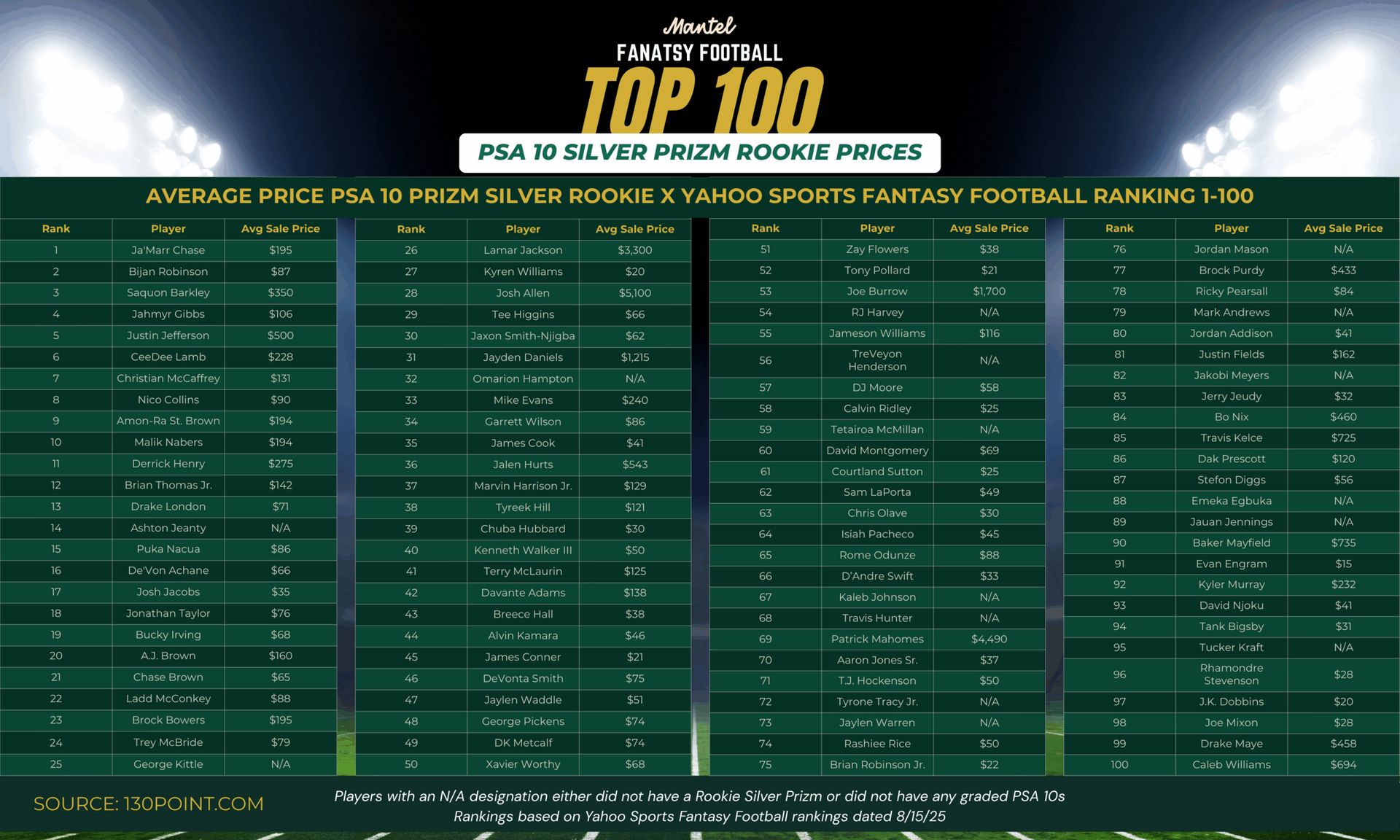 If you’re prepping your fantasy football draft plans, this is a fun one from our Mike Metzler. Using data from 130pt analyzing PSA 10 Prizm Silver Rookie sales against Yahoo’s 2025 fantasy football projections, Mike discovered an interesting disconnect — that card prices and fantasy rankings don’t always go hand-in-hand. For instance, Bijan Robinson, the No. 2 fantasy player, sells for just $87, or less than half of a Malik Nabers card (10th on the Yahoo list, $194 card price). Meanwhile, Caleb Williams ($694) and Drake Maye ($458) outprice veterans like Kyler Murray and Brock Purdy, who are smarter picks for your fantasy roster. Quarterbacks continue to dominate collector value, while RBs, always fantasy gold, remain hobby cold. The edge? Spotting players with fantasy upside and hobby price lag. We don’t give investment advice, but Bijan may be 2025’s crossover steal.