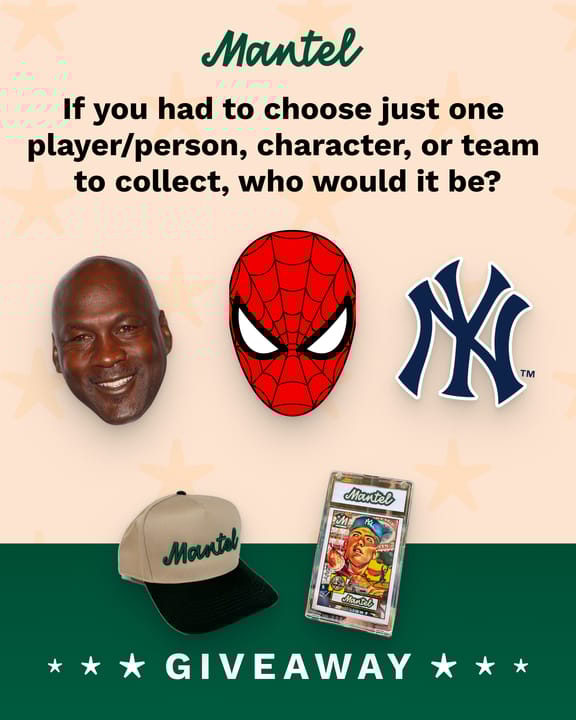 Finally, we’ve got a giveaway you don’t want to miss. We collaborated with card artist Tom Fallos (aka The Card Carver) on a custom trading card packed with easter eggs of some of the greatest collectibles on earth, and we’re giving (at least) one away! To have a shot at one of these limited edition cards, plus a Mantel hat, all you have to do is answer the question: If you had to choose just one player/person, character, or team to collect, who would it be?
