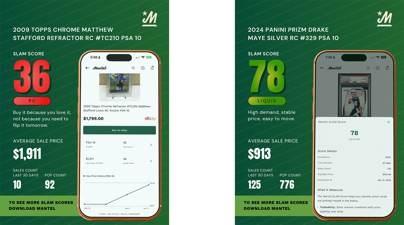 The team at Mantel wanted to help collectors better determine which cards have demand, so we came up with a new metric, SLAM (Secondary Liquidity and Momentum), which is now live in the app.